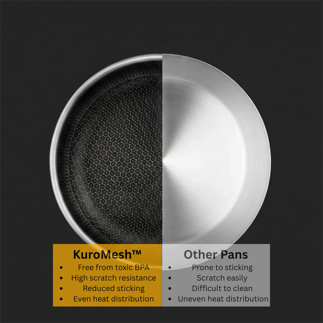Unsere Hybrid-Pfanne mit KuroMesh™ Oberfläche kombiniert die Stabilität von Edelstahl mit einer speziell entwickelten Antihaft-Struktur – für gleichmäßige Hitze, kontrolliertes Anbraten und deutlich einfachere Handhabung im Alltag.